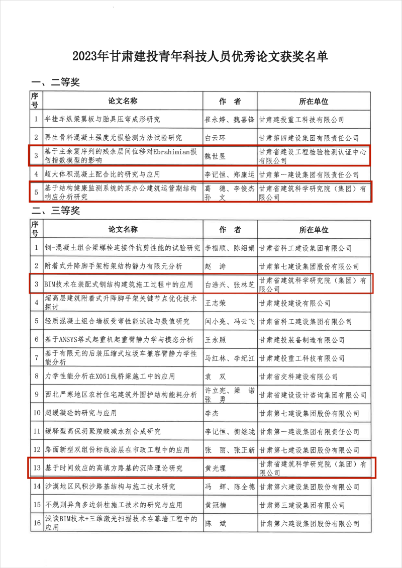 2023年甘肅建投青年科技人員優(yōu)秀論文評審公示已結(jié)束。甘肅建科院共4篇論文獲獎,其中二等獎2篇,三等獎2篇。