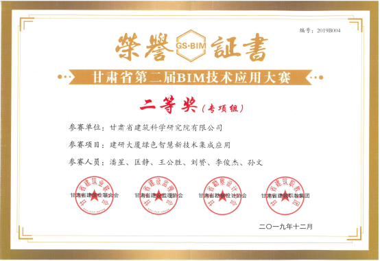 大會為省建科院頒發(fā)了甘肅省第二屆 BIM 技術應用大賽專項組二等獎榮譽證書。由甘肅省建筑業(yè)聯(lián)合會、甘肅省勘察設計協(xié)會、甘肅省建設監(jiān)理協(xié)會、甘肅省建筑職教集團、甘肅建筑職業(yè)技術學院、甘肅益埃畢建筑科技有限公司共同舉辦的甘肅省第二屆 BIM 技術應用大賽,旨在進一步促進 BIM 技術在我省工程建設領域的普及應用,鼓勵創(chuàng)新實踐,弘揚創(chuàng)新文化,加速建筑類高校 BIM人才培養(yǎng)。在本次大賽中,省建科院“建研大廈綠色智慧新技術集成應用”項目通過初審、終審答辯等環(huán)節(jié),獲得了專項組二等獎。