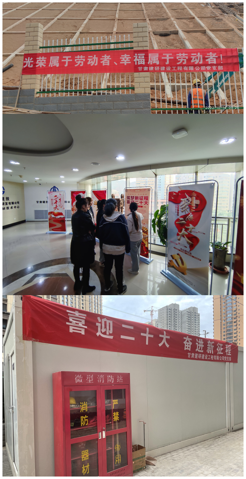 黨的二十大召開之際,甘肅建科院的辦公樓、項(xiàng)目現(xiàn)場裝扮一新,“喜迎二十大,奮進(jìn)新征程”等主題的景觀,營造出祥和喜慶的氛圍。鮮花、黨旗、黨徽和催人奮進(jìn)的標(biāo)語,凸顯全司職工凝心聚力謀發(fā)展,奮發(fā)有為迎盛會(huì)的喜悅。