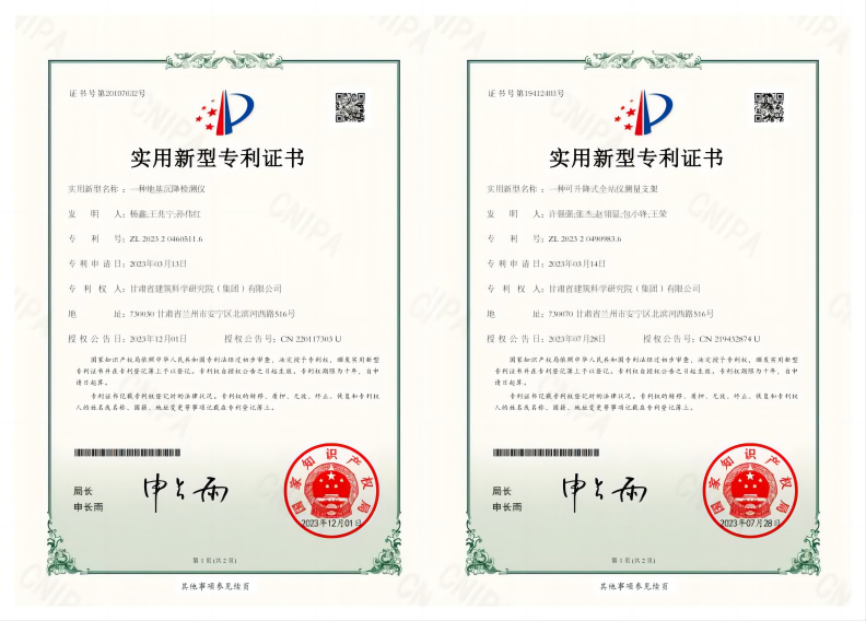 近日,地基巖土專業(yè)事業(yè)部申報(bào)的“一種地基沉降檢測儀”和“一種可升降式全站儀測量支架”兩項(xiàng)實(shí)用新型專利正式獲得國家知識產(chǎn)權(quán)局審核并授予專利通知。
