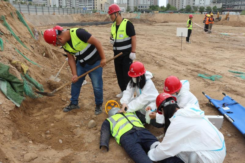 上午10時整,隨著王春景一聲令下,各作業(yè)區(qū)、部室及演練人員迅速到達指定區(qū)域開始模擬基坑塌陷演練。其設置情景是:勞務作業(yè)人員在現(xiàn)場作業(yè)期間發(fā)生土方塌方,該班組安全員發(fā)現(xiàn)了該作業(yè)人員被掩埋,立即上前進行施救,并快速將人員信息傳送至項目部應急領導小組,報告塌方事故的時間、地點等信息。現(xiàn)場指揮根據(jù)事故情況宣布啟動應急預案,立即通知項目部醫(yī)療小組、安全小組帶上擔架、藥箱、警戒線立刻趕往現(xiàn)場準備警戒施救工作,通知救護車輛進場待命。
