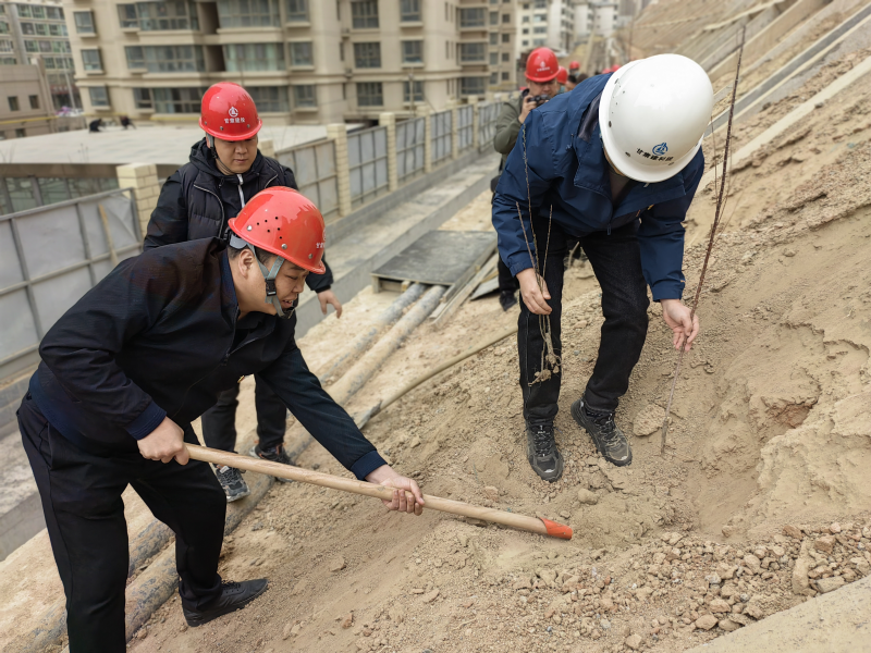 春回大地萬物蘇,植樹添綠正當(dāng)時。3月15日下午,甘肅建科院建研建設(shè)公司黨支部依托九洲新華小區(qū)邊坡加固綠化項目,與項目甲方甘肅新華房地產(chǎn)公司黨支部開展支部聯(lián)建植樹節(jié)主題黨日活動。兩單位領(lǐng)導(dǎo)班子成員、支部委員、團員青年代表、勞務(wù)班組代表共計40余人參加了本次活動。活動由甘肅建科院建研建設(shè)黨支部副書記孫藝珊主持。