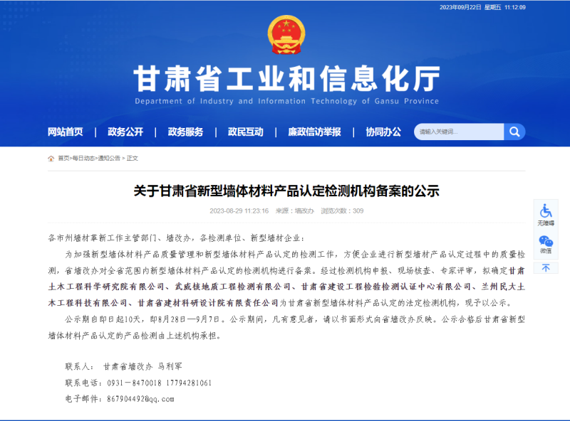 9月21日,在甘肅建科院認證中心成為甘肅省新型墻體材料產(chǎn)品備案認定檢測機構后,省墻改辦主任一行蒞臨甘肅省建設工程檢驗檢測認證中心有限公司,在甘肅建科院黨委副書記、總經(jīng)理史智偉,總工王公勝陪同下考察了公司生產(chǎn)經(jīng)營情況、檢驗檢測水平以及質量技術把關等相關業(yè)務能力,并進行了工作指導。