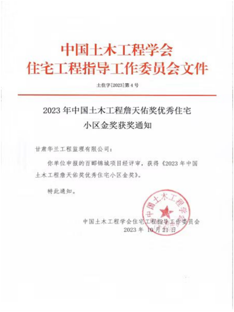 近日,從中國土木工程學(xué)會住宅工程指導(dǎo)委員會傳來喜訊,由甘肅華蘭工程監(jiān)理有限公司參與建設(shè)的成都百酈錦城項目榮獲“2023中國土木工程詹天佑獎優(yōu)秀住宅小區(qū)金獎”。