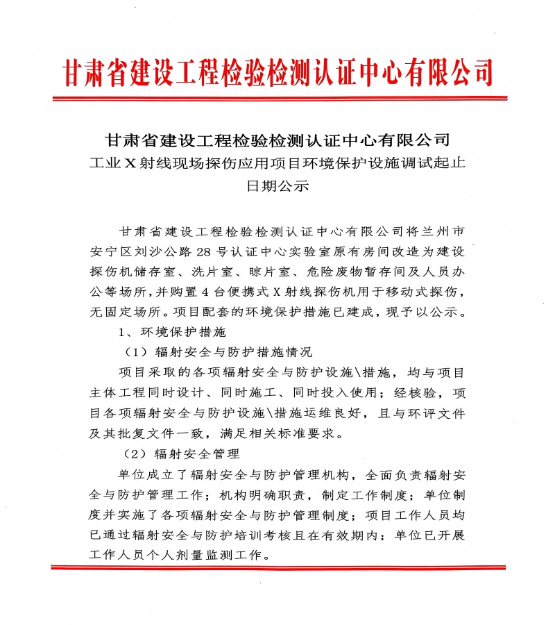 工業(yè)X射線現(xiàn)場(chǎng)探傷應(yīng)用項(xiàng)目環(huán)境保護(hù)設(shè)施調(diào)試起止日期公示