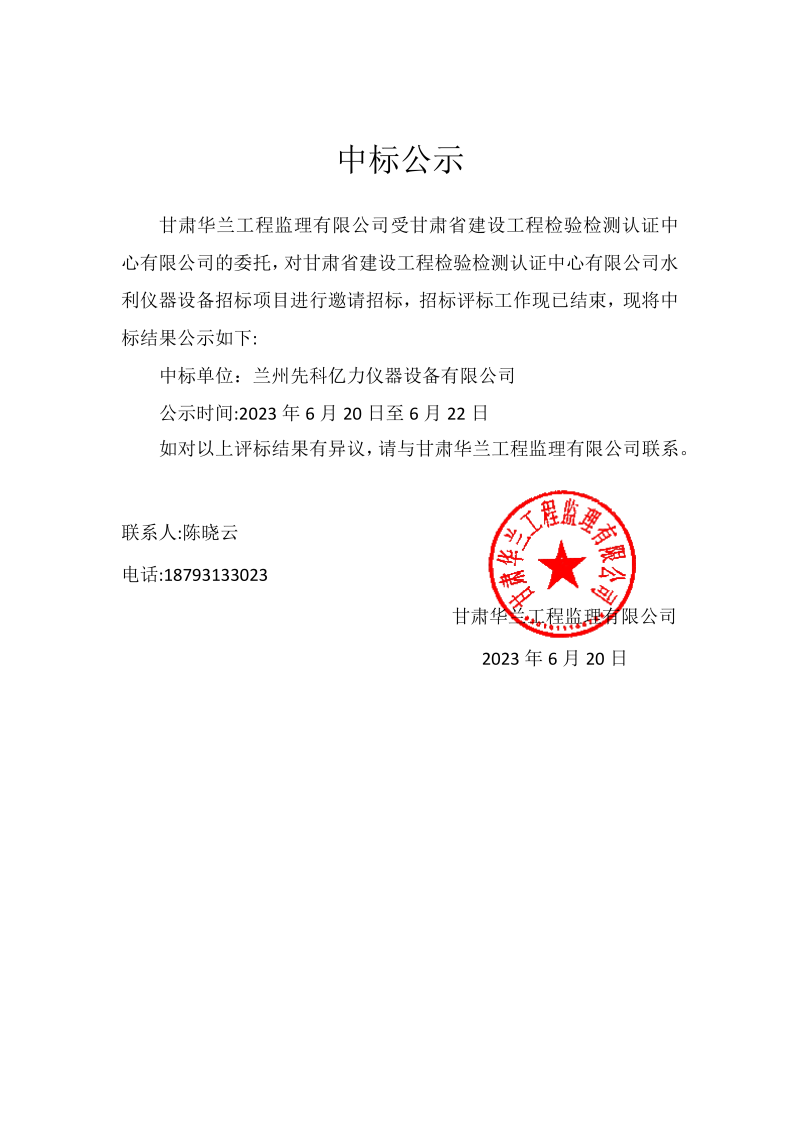 甘肅省建設(shè)工程檢驗(yàn)檢測認(rèn)證中心有限公司水利儀器設(shè)備招標(biāo)項目中標(biāo)公示