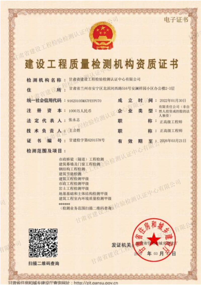 近年來,甘肅建科院以提升核心競爭力為導向,以強化戰(zhàn)略管理、優(yōu)化產(chǎn)業(yè)板塊、完善激勵約束為抓手,聚焦重點難點,補齊短板弱項,堅持檢驗檢測、咨詢服務、特種施工、產(chǎn)業(yè)產(chǎn)品并行的“1+N”發(fā)展模式,提升了企業(yè)的核心動能。成立建設工程檢驗檢測認證中心公司是做精檢測、做優(yōu)服務的重要措施之一。該公司已獲得甘肅省市場監(jiān)督管理局核準頒發(fā)的檢驗檢測機構(gòu)資質(zhì)認定證書和甘肅省住房和城鄉(xiāng)建設廳頒發(fā)的建設工程質(zhì)量檢測機構(gòu)資質(zhì)證書。